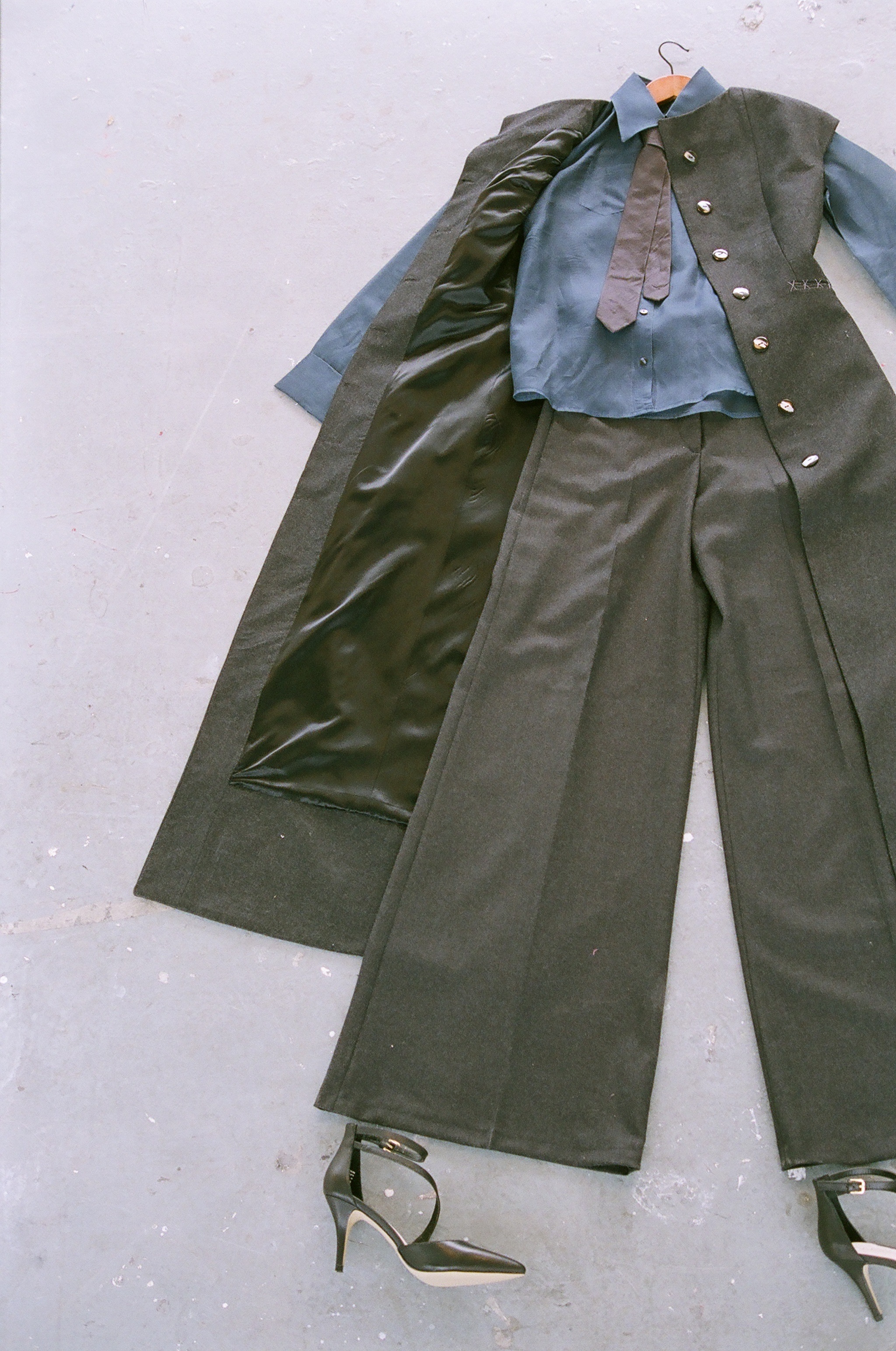 Autoscopy: seeing one’s own body from an elevated and distanced visuo-spatial perspective. Inspired by the work of photographer Francesca Woodman, Elaine’s collection is an exploration of self representation against the external environment through clothing. Woodman chooses herself as the subject in her portraits, sometimes manipulating her body physically or perceptively as a statement of taking control of her self as subject and not object.
